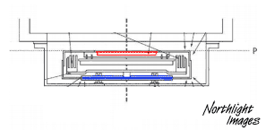 Hier ist zu sehen, dass ein Bauteil (blau) sich mehr oder weniger durchbiegt, was wohl durch Anlegen einer Spannung passiert, und dabei den Sensor (rot) entlang der optischen Achse verschiebt.