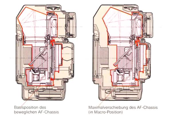 Im Gegensatz zum Canon-Patent wurde dann aber nicht nur die Andruckplatte (entsprechend dem Sensor bei Canon) bewegt, sondern die komplette Einheit aus Schwingspiegel und SLR-Sucher wurde auf Keramikschienen verschoben. Damit wurde mit allen MF-Objektiven von Carl Zeiss, mit denen die Contax-Modelle bestückt werden konnten, die automatische Scharfstellung möglich. Die Contax AX kam dann 1996 auf den Markt. (Quelle: Original-Pressemitteilung und Prospekt für die Contax AX | Archiv d-pixx)