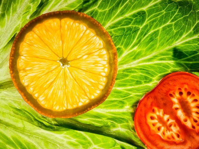 Ein Blatt Eisbergsalat, eine Orangenscheibe und eine Tomatenscheibe – von unten mit einem Yongnuo-Blitz durchleuchtet. Das Salatblatt wurde für die Scheiben jeweils mit einem Cuttermesser ausgeschnitten, damit Orange und Tomate auch schön leuchten und nicht nur dunkel sind!