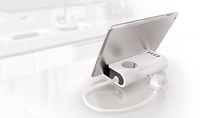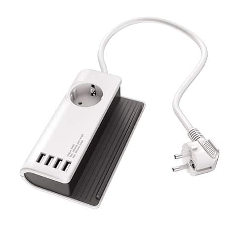 Die neue Vierfach-USB-Tisch-Ladestation mit Steckdose von Hama soll hier Abhilfe schaffen. Der Name ist ein bisschen sperrig, trifft aber den Kern der Neuheit: In einem eleganten Gehäuse sind vier USB-Ports und ein eine 230-V-Schutzkontaktsteckdose zusammengefasst. Bis 3500 W können an fünf angeschlossene Geräte abgegeben werden. Die Gesamtleistung liegt bei 4800 mA.