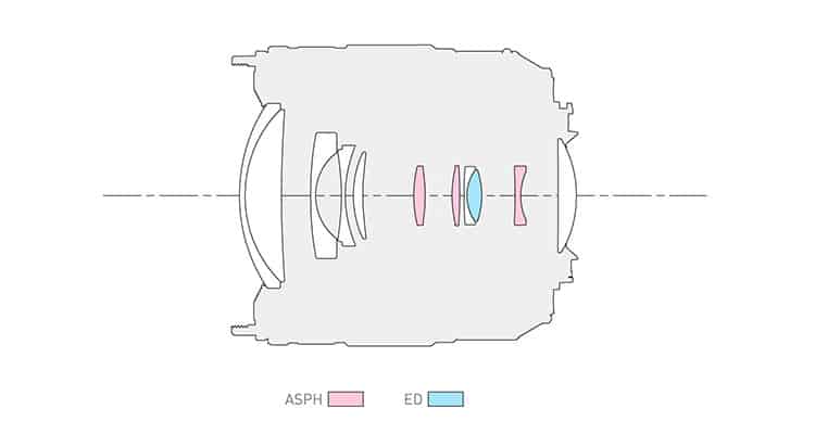 Das Objektiv ist aus 11 Linsen in 9 Gruppen aufgebaut.Der Einsatz von Asphären und Linsen aus ED-Glas soll die Abbildungsleistung auf ein hohes Niveau bringen und dank der Mehrschichtvergütung sollen Überstrahlungen, Reflexe und Geisterbilder minimiert werden.