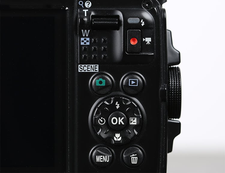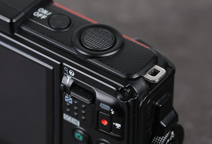 Ganz oben auf der rechten Rückwandseite sind die Zoomwippe und der Movieauslöser untergebracht.