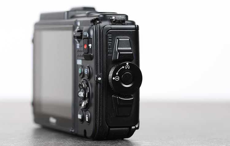 Auf der rechten Schmalseite thront in der Mitte ein großes Rad, mit dem man das kombinierte Akku-/Speicherkartenfach ent- und verriegelt, in dem auch der HDMI- und USB-Port versteckt sind. Das Rad selbst ist ebenfalls verriegelt und lässt sich nur drehen, wenn man den zentralen Knopf drückt. Damit wird verhindert, dass man das Fach versehentlich öffnet und vielleicht doch Schmutz oder Feuchtigkeit ins Kamerainnere gelangen. Der Deckel ist mit einer kräftigen Dichtung versehen.