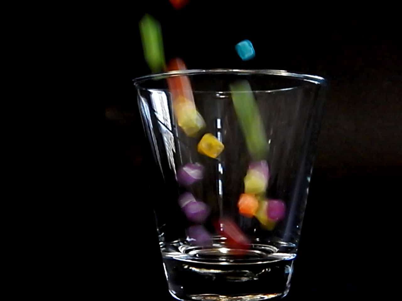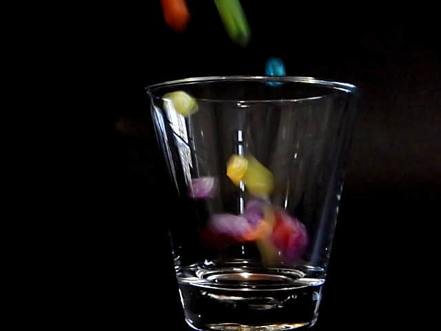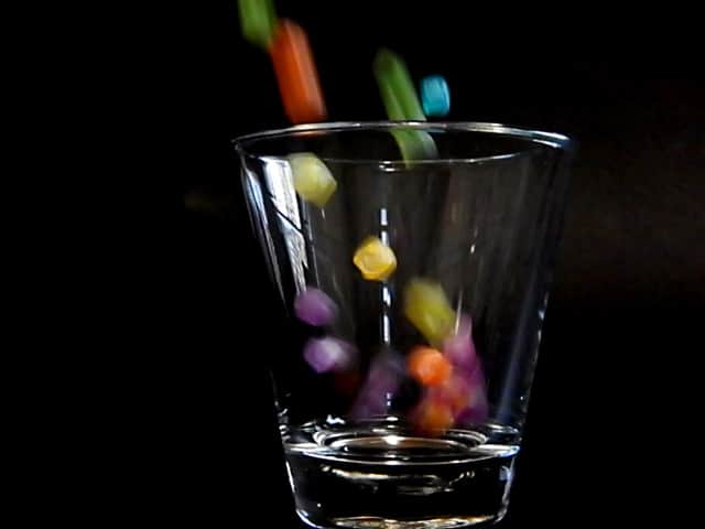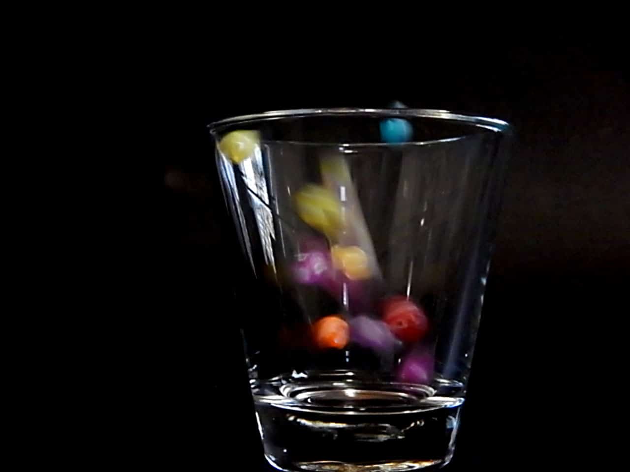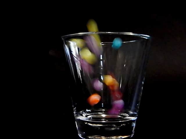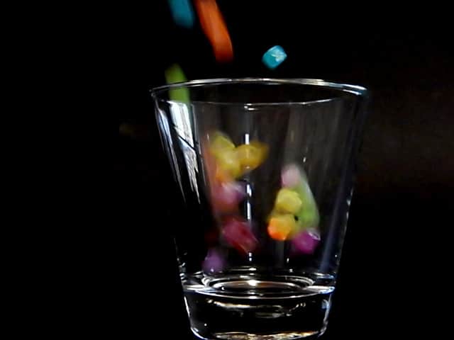 Was hier ins Glas fällt und dann herumhüpft sind kleine bunte Kunststoffwürfel mit Buchstaben, die Kinder auf eine Kordel auffädeln und dann z. B. eine Kette mit ihrem Namen haben.