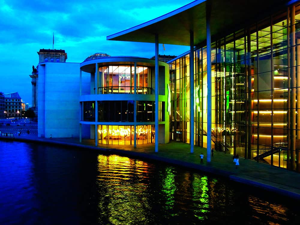 In der so genannten blauen Stunde ist das warme Licht der Dämmerung und des Sonnenuntergangs verschwunden. Zu den nun vorherrschenden Blautönen bildet gelb-orange Kunstlicht einen sehr schönen Kontrast, den man verstärken kann, wenn man den Weißabgleich auf „Tageslicht“ einstellt. Auch wenn viele Kameras bzw. Objektive über effektive Bildstabilisatoren verfügen, ist für solche Aufnahmen der Einsatz eines Stativs zu empfehlen. Und wenn doch keines zur Hand ist, versucht man die Kamera aufzulegen. Wenn der Untergrund nicht ganz waagrecht ist, wählt man einen etwas größeren Bildwinkel und richtet das Bild dann in der Software aus.