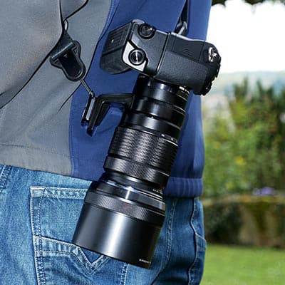 Schraubt man die Platte mit einer Münze oder dem mitgelieferten Innensechskant-Schlüssel ins Gewinde eines Stativrings am Objektiv und versieht sie mit zwei Ankerschlaufen, kann man die Kamera-Objektivkombination im Schwerpunkt tragen. Zwei weitere Ankerschlaufen am Gehäuse sorgen dann dafür, dass man beim Wechsel auf ein kleineres Objektiv den Gurt rasch umklipsen kann.