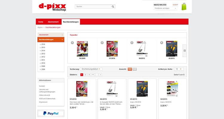 Wie wir erfahren haben, gibt es ein Problem mit dem Modul in unserem Online-Shop, das für die Weiterleitung zu PayPal zuständig ist. Wenn Sie ein Abo für sich oder jemand anderes bestellen oder Hefte nachbestellen möchte, wählen Sie bitte bis auf weiteres die Option „Vorkasse“ oder bestellen Sie per E-mail an abo@d-pixx.de auf Rechnung, die wir Ihnen zusenden. Wir bitten, diese Unannehmlichkeit zu entschuldigen und informieren Sie hier, sobald wieder per PayPal bezahlt werden kann. Vielen Dank.