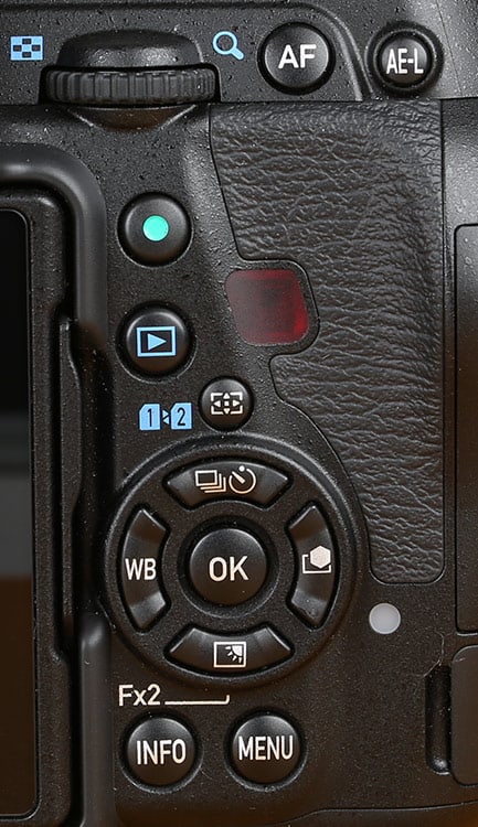 Zu den 12 Tasten gehören die vier des Steuerkreuzes. Mit ihnen erreicht man sofort die Einstellungen für die Bildfolge inkl. Selbstauslöser, Weißabgleich und Bildwirkung („benutzerdefiniertes Bild“). Die untere kann frei belegt werden. In der Grundeinstellung kann man über sie die Helligkeit des Rückwandmonitors an die Umgebungshelligkeit anpassen.