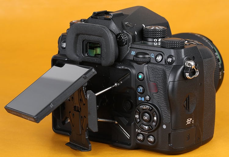 Touch-Screen-Bedienung ist leider nicht vorgesehen – aber dafür erregt der Monitor anderweitig Aufmerksamkeit. Er ist auf einer Trägerplatte angebracht, die über vier bewegliche Streben mit der Rückwand verbunden ist. Dadurch ist es möglich, den Monitor samt Platte um je 44° nach oben und unten, und um je 35° nach rechts oder links zu klappen. Durch die Kombination verschiedener Verstellungen lässt sich der Monitor auch schräg und „windschief“ positionieren, um das Monitorbild jederzeit im Blick haben zu können. Dass der Monitor dabei immer hinter dem Objektiv in der optischen Achse angeordnet ist, macht die Ausrichtung der Kamera einfacher, als mit Monitoren, die seitlich neben die Kamera geklappt werden. Außerdem kann der Monitor um bis zu 90° nach oben geklappt werden – aber nicht weiter. Dass der Monitor also nicht Selfie-tauglich ist, wird von den meisten Käufern der K-1 vermutlich gar nicht bemerkt …