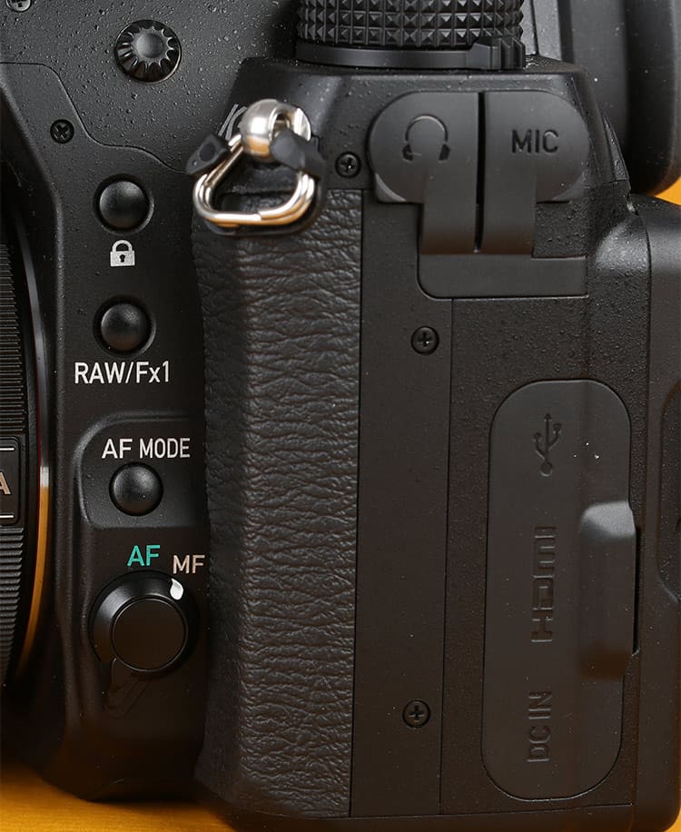 Weitere nützliche Tasten findet man, wenn man die linke Seite des Objektivträgers betrachtet. Mit der einen kann man den AF-Modus ändern, mit der zweiten schnell einmal die Bildaufzeichnung im RAW-Format aktivieren, auch wenn man sich im Menü für JPEG entschieden hat. Die dritte ist mit einem Schlosssymbol gekennzeichnet. Wenn man einmal alle wichtigen Einstellungen vorgenommen hat, kann man hier per Tastendruck dafür sorgen, dass man nichts mehr versehentlich verstellt.