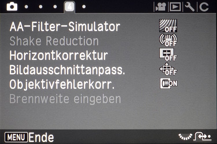 Allerdings gibt es andere Möglichkeiten, die bewegliche Lagerung des Sensors zu nutzen, die in der Praxis wichtiger sind. Bereits angesprochen wurde die Horizontkorrektur (+- 1°), zu der sich eine Shiftkorrektur gesellt. Der Sensor kann um bis zu 1,5 mm nach oben, unten, rechts und links verschoben werden. Verglichen mit den Verstellwegen eines Shiftobjektiv ist das nicht sehr viel – aber diese Möglichkeit wird zum einen kostenlos mit geliefert und kann zum anderen einige Korrekturarbeiten am Rechner überflüssig machen. Außerdem kann der Sensor bei Sternaufnahmen mit längeren Verschlusszeiten gegenläufig zur Erddrehung bewegt werden. Das bewirkt, dass Sterne als Punkte und nicht als kurze Striche ins Bild kommen.