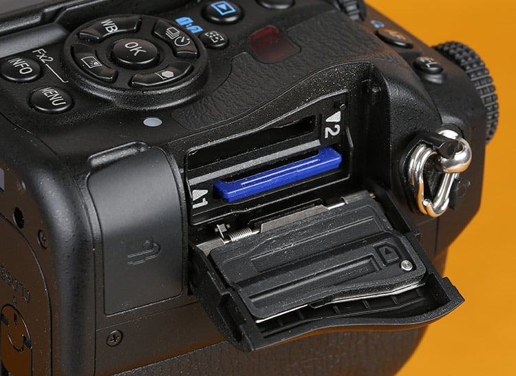 Fürs Speichern stehen zwei SD-Karten zur Verfügung, die nacheinander oder parallel genutzt werden können. Beim parallelen Einsatz kann man doppelt speichern, also ein Backup erstellen, oder JPEGs und RAW-Dateien getrennt speichern – was im Endeffekt ja auch auf ein Backup hinausläuft.