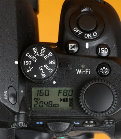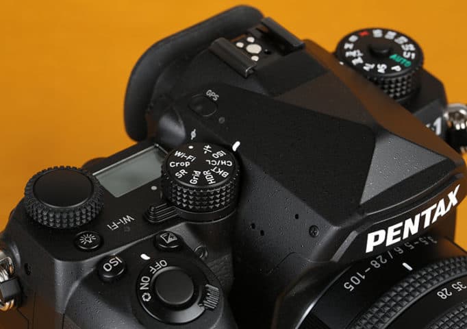 Außerdem zeigt der Blick von oben etwas, das man weder von den K-3- noch von den K-5-Modellen kennt. Ganz rechts außen hinten sitzt ein Einstellrad ohne Bezeichnung, während schräg davor ein Rad zu finden ist, das in 10 Positionen einrastet. Hier wählt man die Funktion, die man mit dem unbezeichneten Rad ein-, aus- oder umschalten möchte. Zur Wahl stehen: Belichtungskorrektur, Empfindlichkeit, Bildfolge, Belichtungsreihe, HDR, Raster im Sucher/auf dem Monitor, Bildstabilisator, Vollformat/APS-Format, WiFi. Außerdem kann man das hintere Einstellrad deaktivieren, indem man das vordere auf den weißen Punkt stellt.