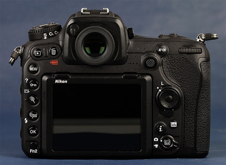 Das zweite Einstellrad ist auf der Rückwand oben rechts außen zu finden und kann gut mit dem Daumen gedreht werden, wenn sich die D500 aufnahmebereit am Auge befindet.