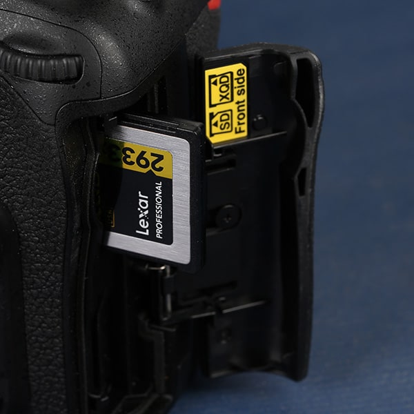 Nikon setzt bei beiden Modellen auf die noch recht neuen XQD-Speicherkarten. Allerdings sind bei der XQD-Version der D5 (es gibt parallel auch eine für CF-Karten) beide Slots für XQD ausgelegt, während bei der D500 ein Slot für XQD- und einer für SD- / SDHC- / SDXC-Karten vorhanden ist. Manchen Fotografen wären zwei SD-Slots lieber, da die XQD-Karten teurer sind und SD-Karten in viele Laptops direkt eingesetzt werden können. Aber da die D500 als „Tempo-Kamera“ positioniert wird, um das schon hier zu erwähnen, ist die Entscheidung für einen XQD-Slot richtig.