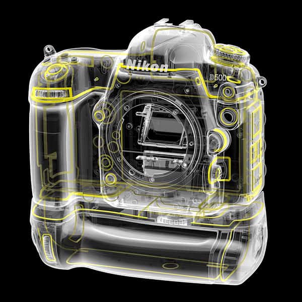 Das Gehäuse der D500 besteht aus einer Magnesiumlegierung (Kappe und Rückseite) und verstärktem Karbon (Front). Das spart Gewicht. Das Gehäuse wiegt mit Akku rund 855 g (eine XQD-Karte addiert rund 6 g, eine SD-Karte rund 2 g.) Das ist zwar kein Federgewicht, aber doch sehr bemerkenswert, zumal das Gehäuse nicht klein ist. Mit einer Breite von 147 mm, einer Höhe von 115 mm und einer Tiefe von 81 mm ist es ungefähr so groß wie die Canon EOS 7D Mark II (149 x 113 x 78 mm, 910 g) und ein Stück größer als eine Pentax K-3 II (131 x 100 x 77 mm, 800 g), die ebenfalls DSLRs mit APS-Sensoren sind.