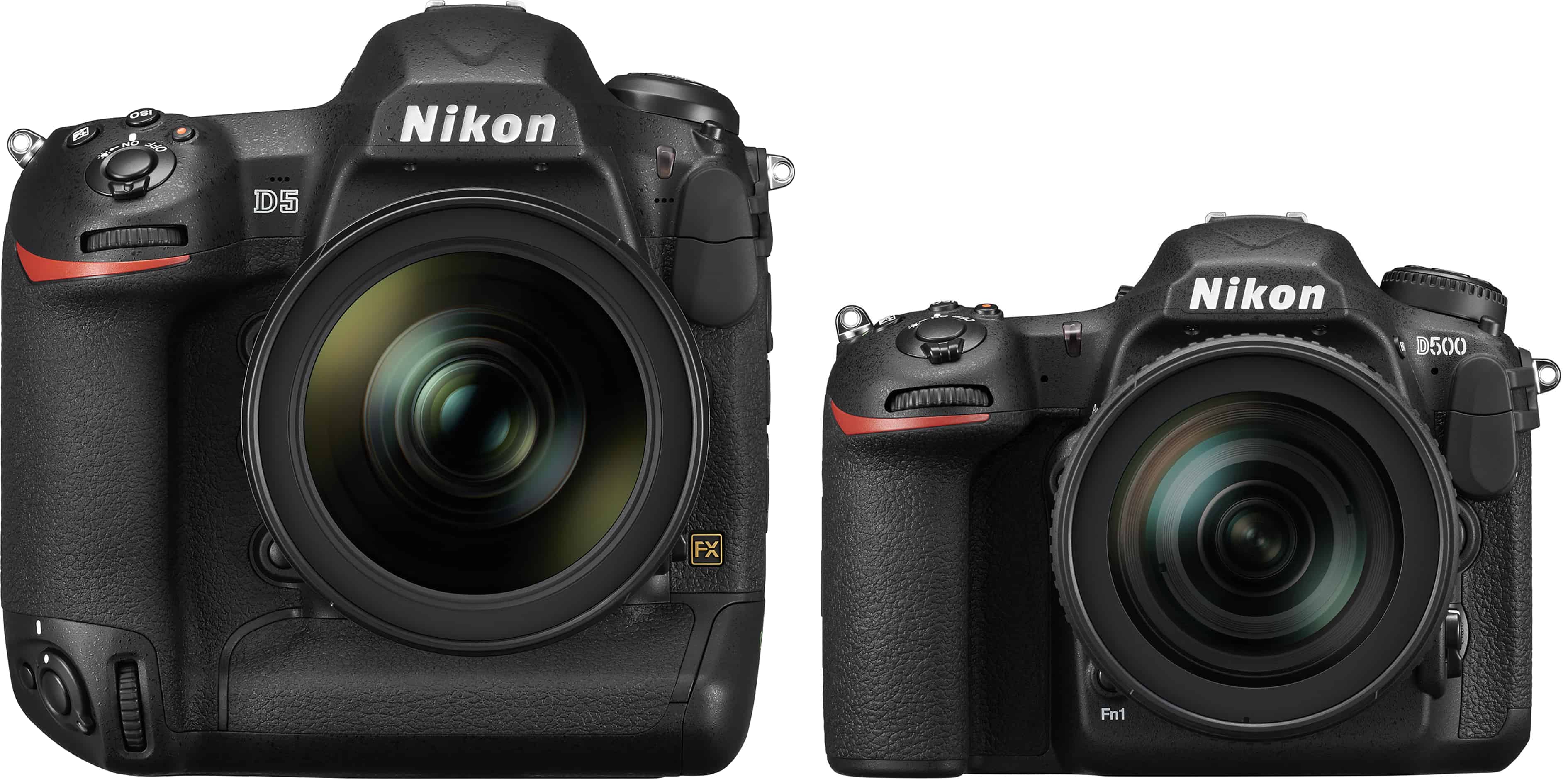 Sie bieten auch eine fast identische Auflösung des CMOS-Sensors. Bei der D500 sind die größten Bilder 5568 x 3712 Pixel groß, bei der D5 sind die Bilder um 20 Pixel breiter. Beide spielen also in der 21-MPix-Klasse. Allerdings sind die Pixel der D5 größer, da sie einen 35,9 x 23,9 mm großen Vollformatsensor aufweist, der rund doppelt so groß ist, wie der APS-Sensor der D500 (23,5 x 15,7 mm).