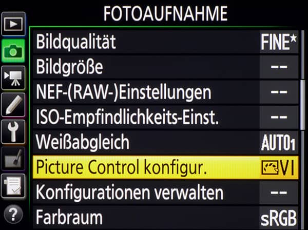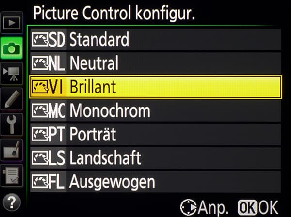 Farben und Kontraste lassen sich auch über das Picture Control-Menü an die eigenen Vorstellungen anpassen, das sieben Einstellungen bietet. Darunter „Ausgewogen“.