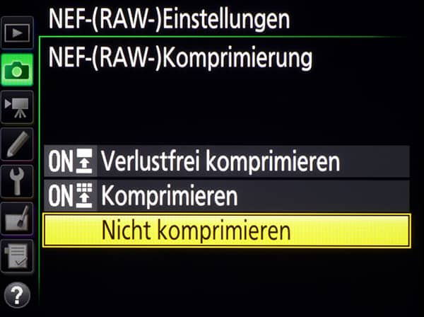 In der Praxis ist aber die Empfehlung: DX-Format, größte Bildgröße, Dateiformat NEF unkomprimiert oder JPEG L Fine*. Passend zum Einsatzzweck können auch RAW- und JPEG-Dateien parallel gespeichert werden.