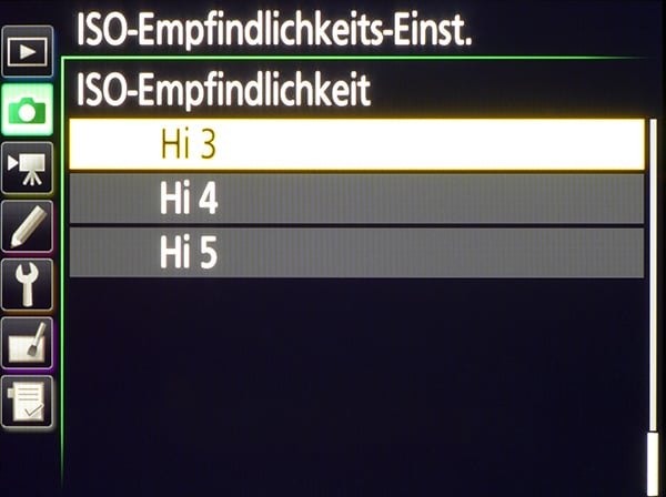 Auch nach oben kann die ISO Reihe erweitert werden. Die Einstellungen H1 bis H5 entsprechen ISO-Werten von 102.400 bis 1.640.000 (eine Million sechshundertvierzig Tausend).