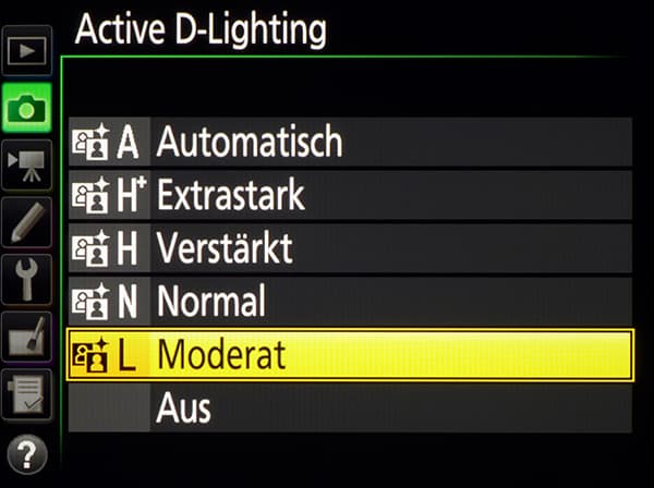 Dazu gehören Active D-Lighting für mehr Durchzeichnung in Lichtern und Schatten. Kontrastreiche Motive kommen schon mit den Einstellungen „Normal“ und „Moderat“ ein ganzes Stück besser ins Bild. „Verstärkt“ und „Extrastark“ sind den wirklichen haarigen Situationen vorbehalten – aber auch hier gilt wieder einmal, dass man bei der Entwicklung der 14-Bit-RAW-Dateien präziser auf die problematischen Bereiche im Bild Einfluss nahmen kann.