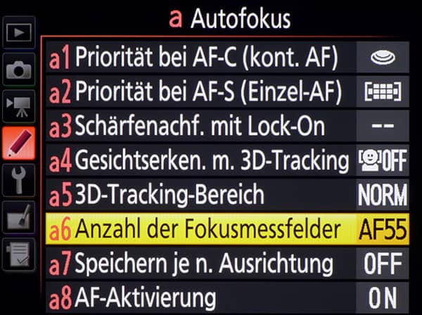 Diese gute Abdeckung des Bildfeldes ist für alle Arten von Aufnahmen praktisch, besonders aber dann, wenn man die Tracking-Funktion nutzt. Im AF-C-Modus wird das gewählte Objekt gegebenenfalls von Messfeld zu Messfeld weitergereicht und bleibt in der Schärfe. Das funktioniert auch mit kleinen Objekten zuverlässig.