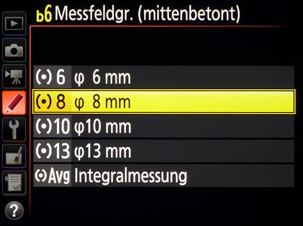 Die Matrixmessung macht einen sehr sicheren Eindruck, aber gerade alte Nikon-Hasen wählen gern die typische Variante der mittenbetonten Messung. Man kann zwischen verschieden großen Kreisen wählen, die in der Bildmitte angeordnet sind. Was hier gemessen wird, bestimmt den Messwert zu 75%, was außerhalb lieht, trägt 25% zum Messergebnis bei. (Der zentrale Kreis kann nur festgelegt werden, wenn ein Objektiv mit CPU verwendet wird.)