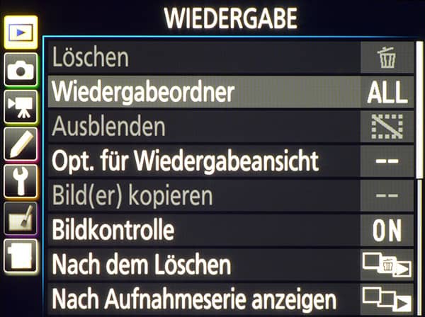 Das Hauptmenü wird über die MENU-Taste aufgerufen und ist, wie bei einer Nikon dieser Klasse nicht anders zu erwarten, nicht nur sehr umfangreich, sondern sehr, sehr umfangreich. Es gibt schier zahllose Möglichkeiten, etwas ein-, aus- oder umzustellen. Allein das in die Segmente von a bis g untergliederte Menü „Individualfunktionen“ bietet 50 Möglichkeiten auf die Kamera Einfluss zu nehmen. Und auch die Möglichkeiten, die Funktion des AF zu konfigurieren, sind üppig.