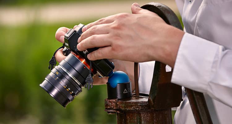 Der MagicBall ist ein Kugelkopf, der auf dem Prinzip der Umkehrung beruht. Nicht die Kugel mit dem Kameraanschluss bewegt sich in einer festen Halterung, sondern eine Halterung mit Kameraanschluss bewegt sich über eine fest stehende Kugel.