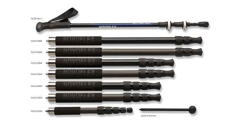 Es stehen Beine in Alu- und Carbon-Ausführung mit 2 bis 4 Auszügen und unterschiedlichen Längen zur Verfügung. Auch die Novoflex Wanderstöcke und Mini-Beine („Trommelstöcke“) können verwendet werden.