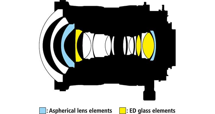 Das 19-mm-PC-Objektiv ist aus 17 Linsen in 13 Gruppen aufgebaut. Darunter sind 3 Linsen aus ED-Glas und 2 Asphären.