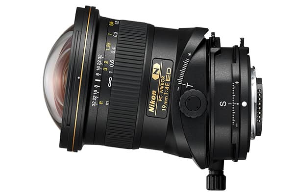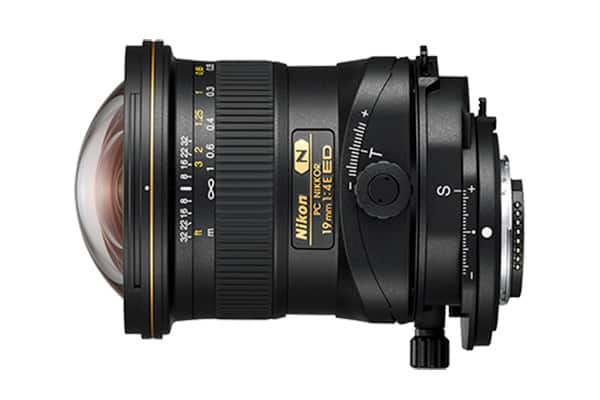 PC Nikkor 19 mm 1:4 E ED aus. PC steht in diesem Fall für Perspektivkorrektur – es handelt sich also um ein Tilt&Shift-Objektiv.
