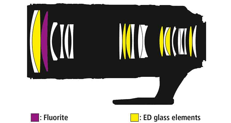 Das optische System besteht aus 18 Gruppen, die 22 Linsen (davon 6 ED-, 1 Fluorit- und 1 HRI-Linsen). Die Blende wird von 9 abgerundeten Lamellen gebildet.