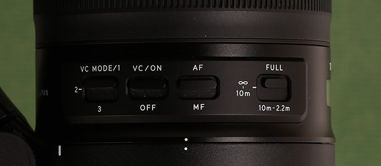 Am ersten Schalter kann man den AF-Bereich wählen: 2,2 m – 10 m, 10 m bis Unendlich oder 2,2 m bis Unendlich (FULL). Am zweiten Schalter wechselt man zwischen automatischer und manueller Scharfstellung (AF/MF).
