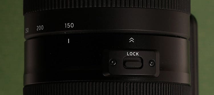 Außerdem gibt es auf der 14-Uhr-Position hinter dem Zoomring den Schalter [LOCK], mit dem sich der Ring in der 150-mm-Stellung arretieren lässt. Damit wird das Kriechen des Zoomrings zu längeren Brennweiten verhindert, wenn das Zoom beim Transport nach unten gehalten wird.