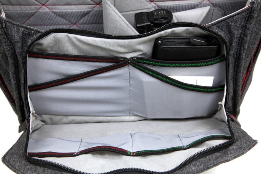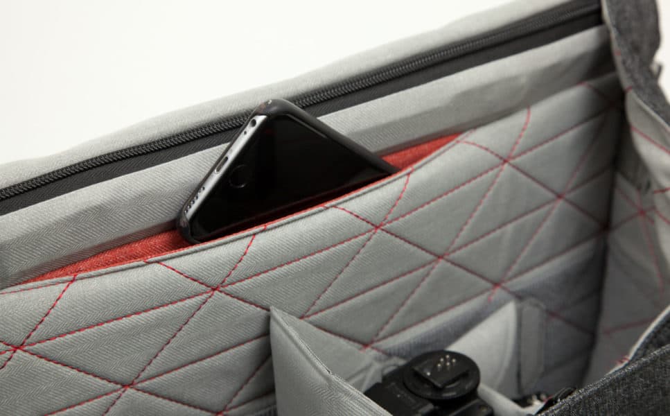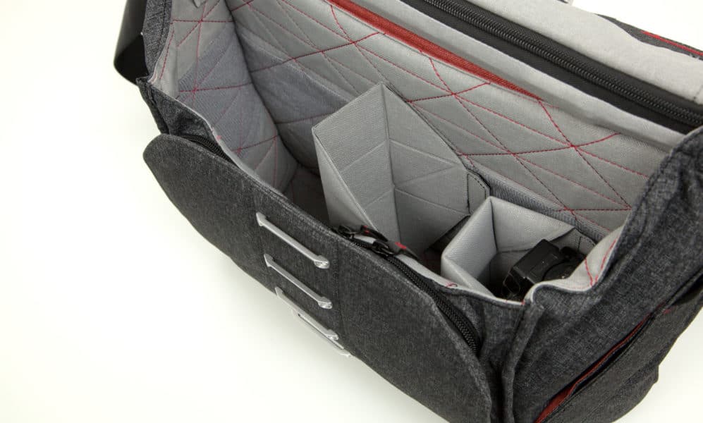 Jetzt aber zum Wichtigsten, dem Innenaufbau. Peak Design setzt auf ein Hauptfach, das mit 13,5 – 20,5 Litern nicht allzu groß dimensioniert ist, dank seines flexiblen Aufbaus aber problemlos Platz für eine größere spiegellose Systemkamera mit angesetztem Objektiv (im Format der Sony Alpha 7, Olympus OM-D-Modelle oder Fujifilm X-T1), zwei bis drei weitere Objektive und einen Blitz bietet. Möglich wird das auch durch die flexiblen Abtrennungen. Die erlauben es nicht nur, das Fach prinzipiell in vier Sektionen zu unterteilen, sondern dank eines Faltmechanismus auch das Stapeln der Objektive. Wer mehrere kompakte Objektive mitnehmen möchte kann so problemlos bis vier Objektive transportieren. Im besten Origami-Stil kann die Abtrennung auch in der Höhe halbiert werden, sodass es einfacher wird auf kleine Objektive zuzugreifen, die Polsterwirkung wird gleichzeitig natürlich verdoppelt. Prinzipiell kann auch eine große DSLR vom Format einer EOS 5D problemlos eingepackt werden, dann wird allerdings der Platz für weitere Objektive und das Notebook schnell eng.