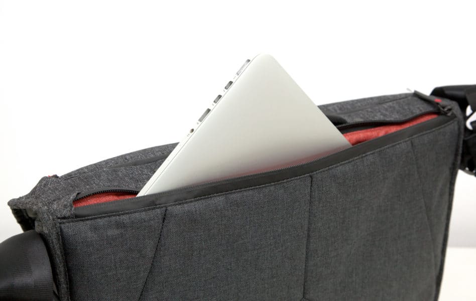 Unser Testmuster setzt auf ein grau meliertes 500D-Codura-Nylon, das einen robusten Eindruck hinterlässt und gleichzeitig wasserabweisend sowie abriebfest ist, alle Reißverschlüsse sind zudem wasserdicht ausgeführt. Ein separates Regencover gibt es hingegen nicht, bei wolkenbruchartigen Niederschlägen ist es daher in jedem Fall empfehlenswert, einen sicheren Platz aufzusuchen. Die einzigen Eyecatcher an der Tasche, die es auch in Braun gibt, sind daher einige rote Nähte und das recht auffällige Verschlusssystem, genannt MagLatch.