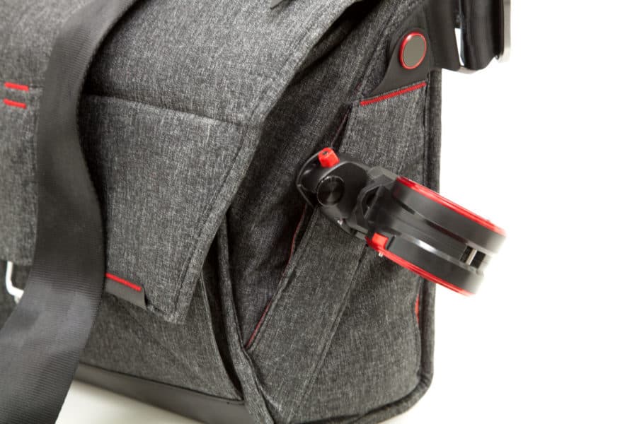 Auf beiden Schmalseiten der Tasche wurden Befestigungsmöglichkeiten für CaptureClips von Peak Design vorgesehen. Diese erlauben es, entweder eine Kamera mithilfe der Stativplatte oder aber zwei Objektive schnell zugänglich an den Seiten zu befestigen. So wird ein guter Mittelweg geschaffen: Die Kamera oder ein beliebtes Wechselobjektiv bleibt schnell zugänglich, ohne dass stets die Tasche geöffnet werden muss. Gesichert wird das angebrachte Gerät über eine kleine Taste, die zum Abnehmen gedrückt werden muss.