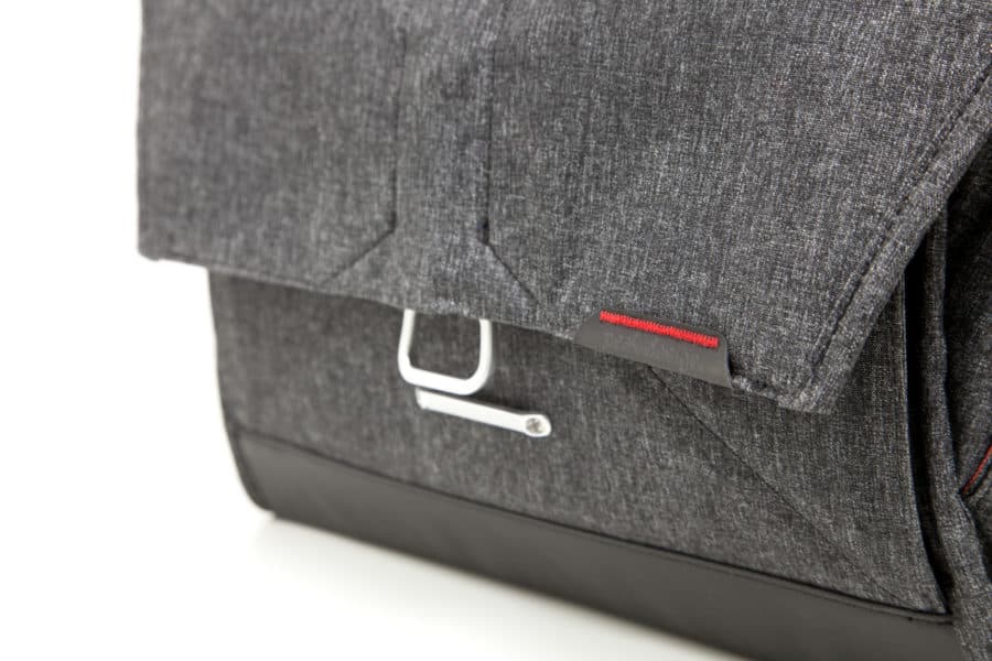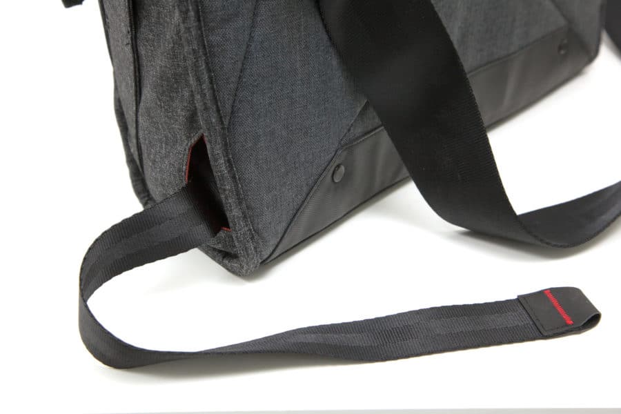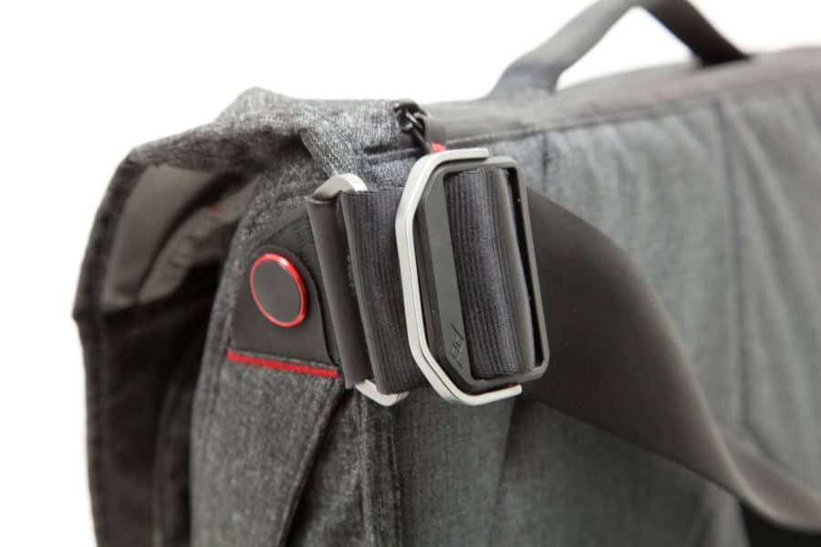 Natürlich darf auch der für Messenger-Bags wichtige zweite Gurt nicht fehlen, der einen stabilen Sitz der Tasche beim Radfahren ermöglicht. Sollte dieser nicht genutzt werden, bietet PeakDesign eine recht elegante Lösung, denn er wird in einem kleinen Fach verstaut und kann bei Bedarf einfach herausgezogen werden. Am Hauptgurt wird wird dieser über einen kleinen Haken befestigt, was in der Praxissicheres Tragen ermöglicht.