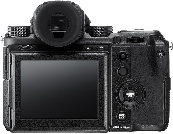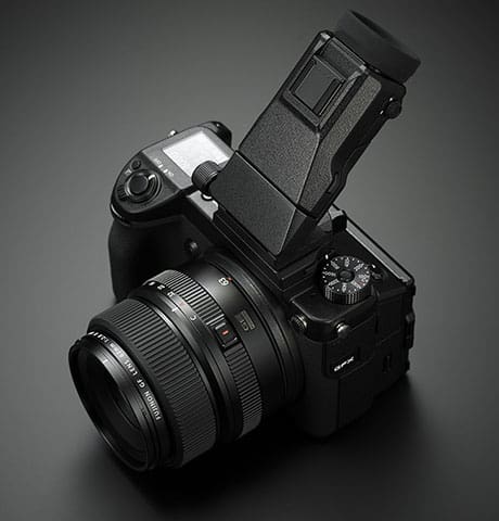 Die GFX 50S ist mit einem abnehmbaren elektronischen Sucher ausgestattet, der über einen 0,5“ großen OLED-Monitor mit einer Auflösung von 3,69 Mio. Dots verfügt. Mit Hilfe eines Adapters (Zubehör) kann der Sucher um bis 90° im Quer- und bis zu +-45° im Hochformat abgewinkelt werden.