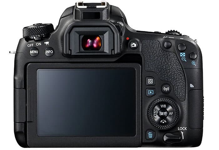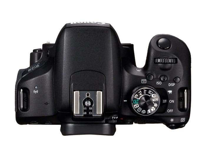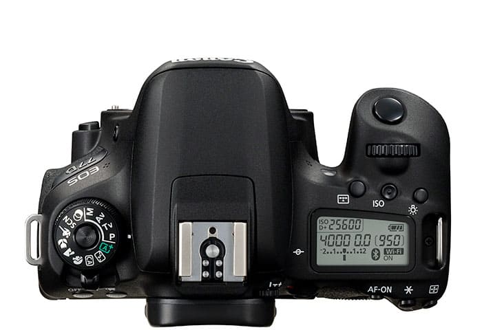 Die EOS 77D bietet einen LCD-Statusmonitor auf der rechten Schulter, das Betriebsartenwählrad und den Hauptschalter links, und sie hat auf der Rückwand ein kleines Daumenrad.