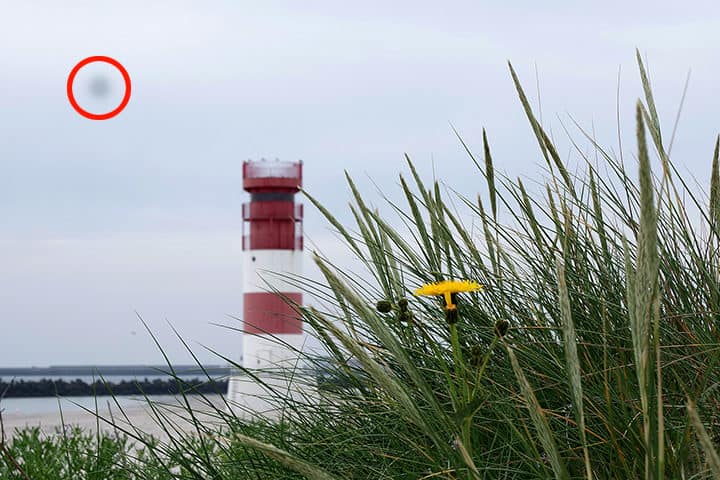 Ab und zu sollte man einfach so mit einem „Leerschuss“ feststellen, ob Staub auf den Sensor gelangt ist. Man nimmt dafür eine möglichst einfarbige Fläche unscharf auf (Entfernung entsprechend manuell einstellen), wobei man die kleinste Blende nutzt. Es ist kein Problem, die Kamera während der Belichtung zu bewegen. Je unschärfer der Hintergrund, desto besser wird der Staub als dunkler, scharfer Fleck sichtbar. (Je weiter offen die Blende, desto unschärfer der Fleck).