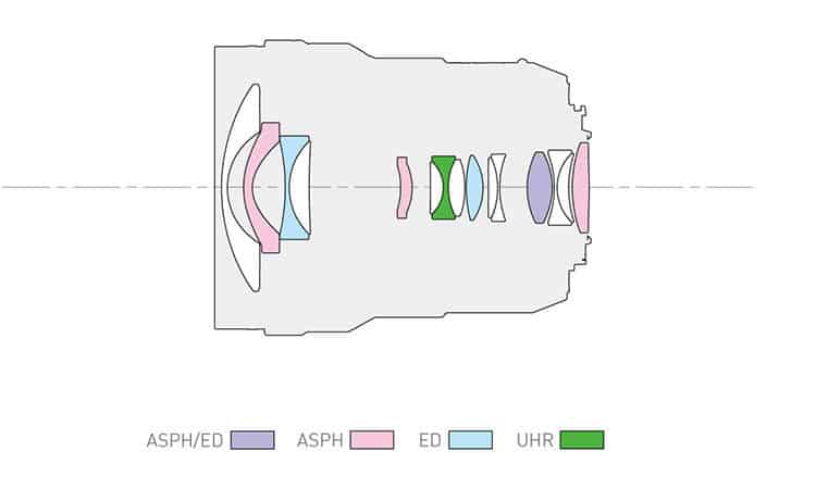 Der optische Aufbau besteht aus 15 Linsen in 10 Gruppen. Mit dabei sind 1 asphärische ED-Linsen, 3 Asphären und 2 ED-Linsen sowie eine UHR-Linse. Diese Kombination soll sphärische und chromatische Aberrationen wirkungsvoll unterdrücken und für eine hervorragende Bildqualität bis zum Bildrand sorgen (was wir baldmöglichst in einem Praxistest überprüfen werden).