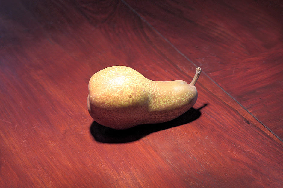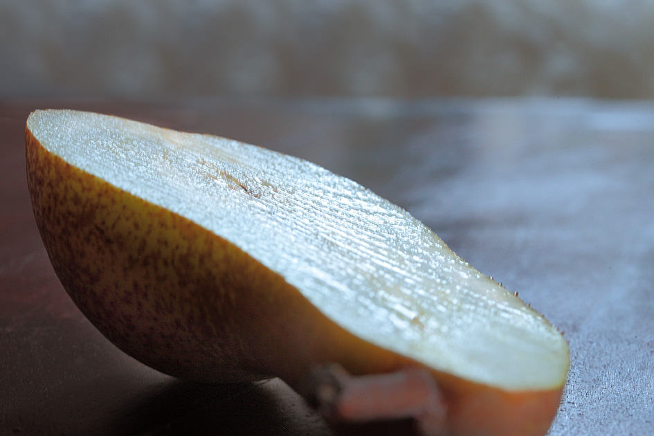 Mit diesen Aufnahmen habe ich etwas herausgefunden: Das Schönste an einer Birne war für mich heute eine Fantasie, die sie in mir entfacht hat. Nämlich dass sie ihr Innenleben ebenso anmutig verspricht wie verbirgt. Mein Bild, meine Vorstellung von Fleisch, Raum und allem, was sie in sich beschützt: das transluzente Geheimnis und dazu ihr schwungvolles Drumherum. Wie eine grobe Keule und doch wie eine feine, zarte Umhüllung. Ich habe ihr den Gefallen getan, sie eben gegessen – und bilde mir ein, dass ich das schmecken kann.