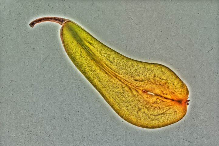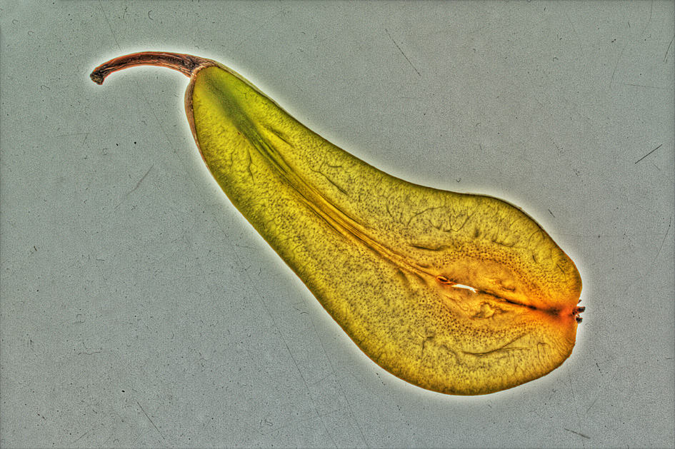 Der Entschluss steht fest: Ich werde die Birne als transluzente Scheibe fotografieren, also im Durchlicht. Dafür schneide ich von der Schnittfläche mit einem sehr scharfen Messer eine möglichst dünne Scheibe ab und platziere sie vorsichtig auf einer Plexiglasplatte. Die gibt es günstig, alt und schön zerkratzt in der Resteabteilung eines jeden Baumarkts.