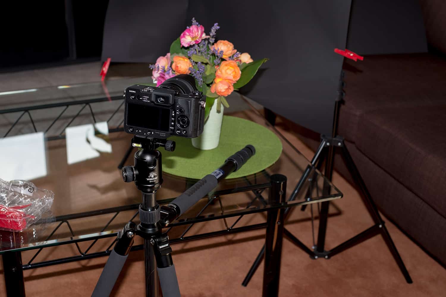 Die Beine werden auf die Minimallänge von 45,5 cm gebracht, um einen Blick in den Strauß zu ermöglichen (und wenn ein Blick von oben gewünscht wird, wird eine größere Höhe ruckzuck erreicht.) Kleines Problem. Mit drei Stativbeinen auf dem Boden komme ich nicht nah genug an die Blumen. Lösung des kleinen Problems: Eines der Beine wird waagrecht gestellt (geht schnell) und auf die Tischplatte gelegt.