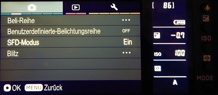 An der Kamera wird für die Aufnahme schon einmal der SFD-Modus aktiviert. Das geht auf der zweiten „Karteikarte“ des übersichtlichen Aufnahmemenüs.