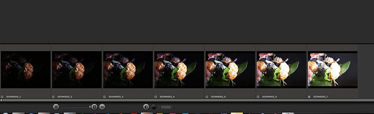 Nun werden die sieben in der Datei enthaltenen Bilder mit ihren unterschiedlichen Belichtungen in einer Reihe angezeigt und man kann wählen, welche Belichtungsstufen verwendet werden sollen. In der Regel kommt man zu sehr guten Ergebnissen, wenn man alle sieben Varianten wählt.