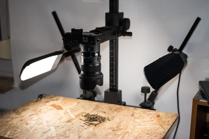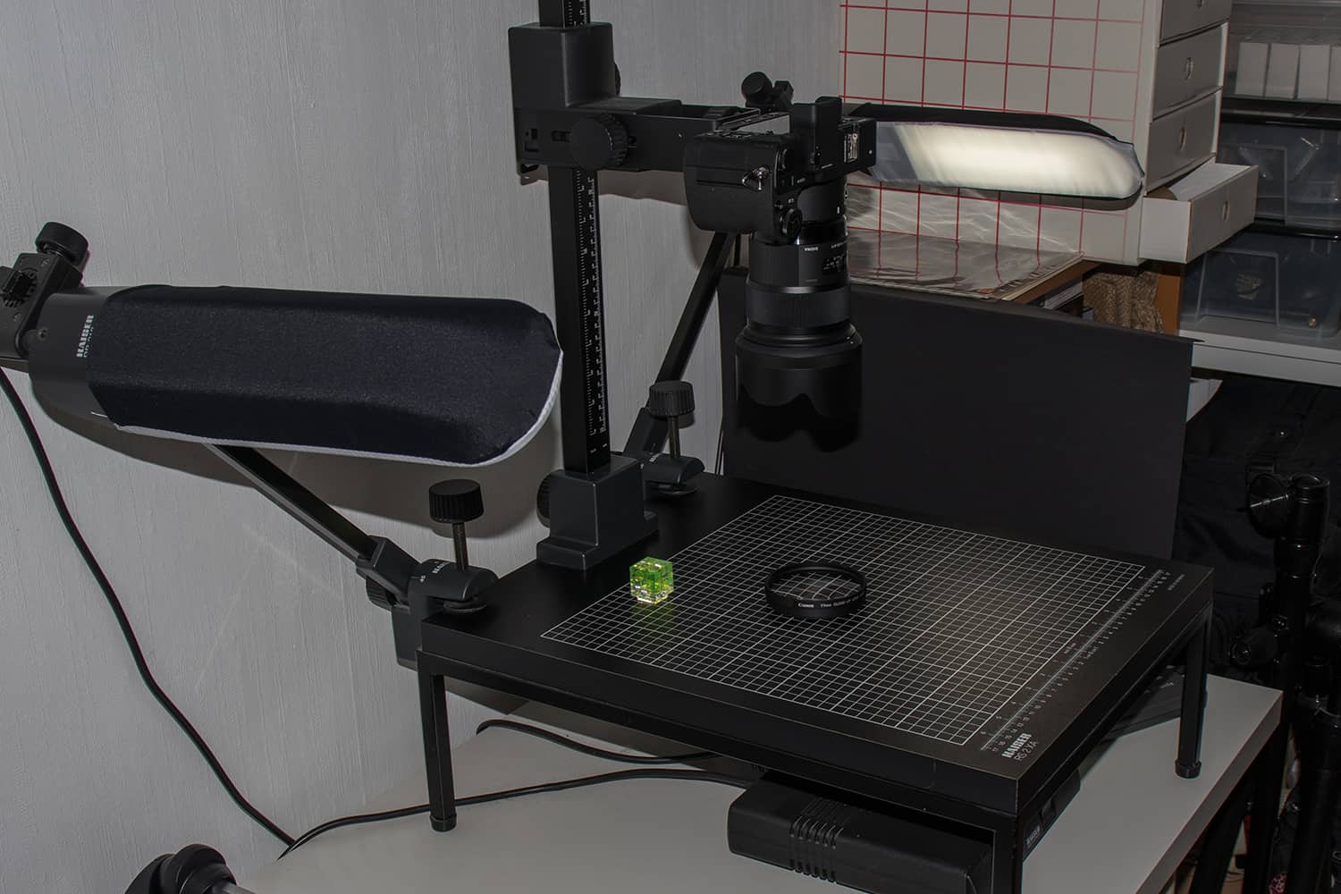 Um es mir einfach zu machen, setzte ich die Kamera an mein Kaiser Reprostativ (RS 2 XA). An der Führungssäule kann die Kamera per Kurbeltrieb bis 70 cm über der Grundplatte positioniert werden. Außerdem lässt sich die Kamerahalterung nach vorn schieben, sodass das Objektiv leicht auf das Hauptmotiv ausgerichtet werden kann. Ich lege das Objekt oft auf eine Platte, die ich zu Feinabstimmung des Bildausschnitts verschieben kann, und die gleich noch einen passenden Untergrund für das Motiv bietet.