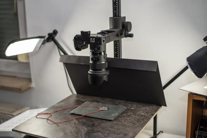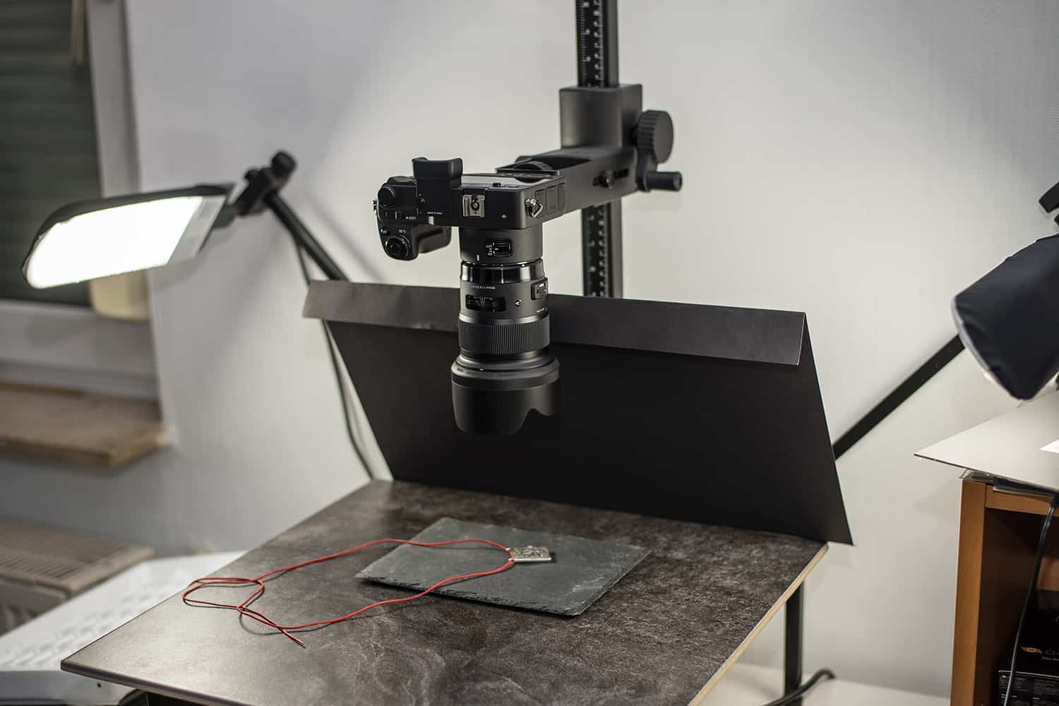 Das Licht aus den beiden Reproleuchten ist ein bisschen zu flach, um die Strukturen in der Oberfläche des alten Schmuckstücks gut sichtbar zu machen. Abhilfe schafft ein schwarzer Karton, der sich Richtung Medaillon neigt (und von der Kamera gehindert wird, darauf zu fallen).
